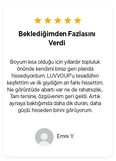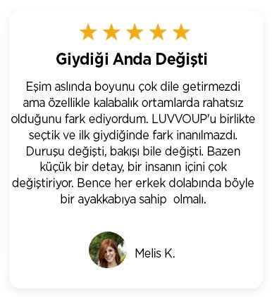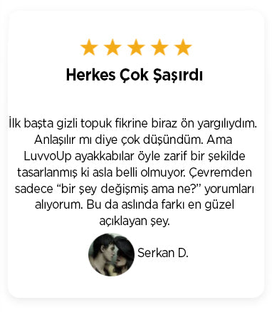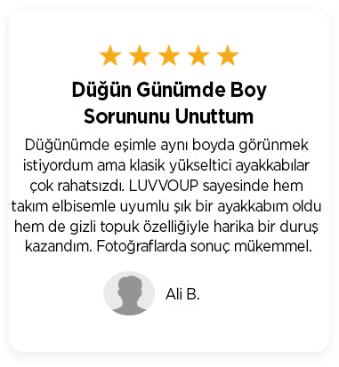 Evet! LUVVOUP modelleri, dışarıdan fark edilmeyen özel gizli topuk yapısıyla 2 ila 10 cm arasında ekstra boy kazandırır. Üstelik tamamen doğal bir duruşla.